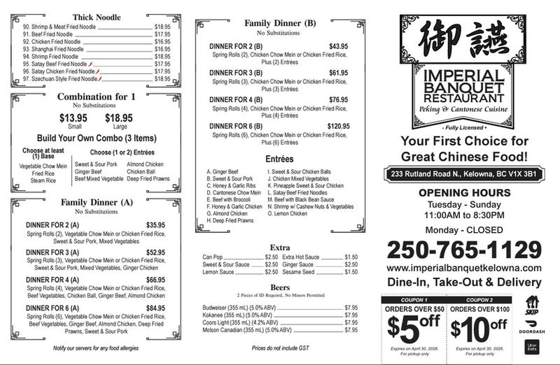 When you’re in the mood for hot, tantalizing Chinese food in Kelowna, head for Imperial Banquet Restaurant, located on Rutland Road across from Rutland Centennial Park. You can dine in for a relaxing evening of Cantonese and Szechuan-style dishes that tempt the most discerning palates, or you can order take out or delivery for a quick, nutritious meal at home.
